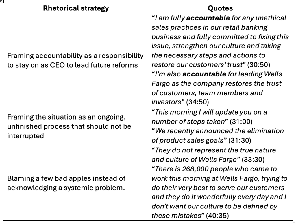 Based on Roulet & Pichler’s (2020) blame-game theory, present the four main pathways theyr identify. Analyze Joe Stumpf’s defence during his opening address and answers to the House of Representatives (14’50-31’00) by identifying his rhetorical strategies (see example below). Using Roulet & Pichler’s (2020), shed a light on Stumpf’s attempt at cultivating « high attributional ambiguity » to avoid « Pathway D ».